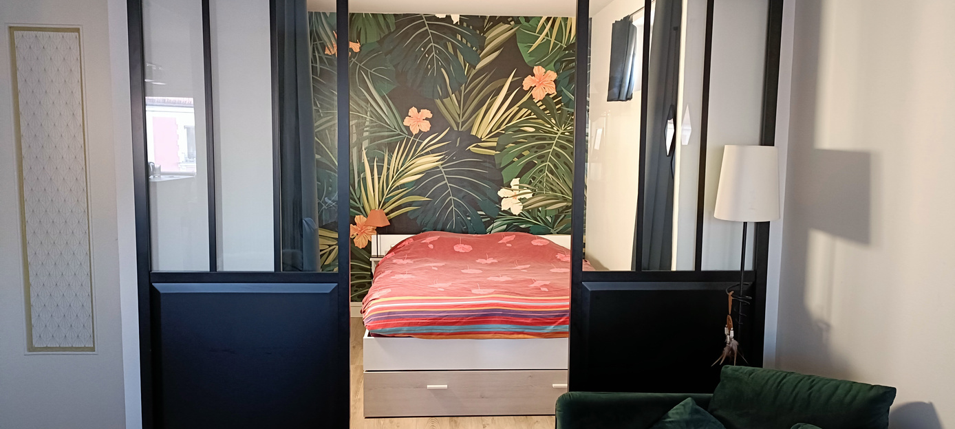 Deux portes-verrières coulissantes ont été ajoutées entre la chambre (possédant une petite fenêtre exposée sud) et le salon avec un décor tropical en tête de lit.